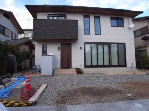・駐車スペースを4台分確保してほしいとのご希望でしたので、無機質になりがちな土間コンクリート打ちだけにせずに、アプローチ部分は強度のあるコンクリート平板(ブラウン)を敷き並べました。