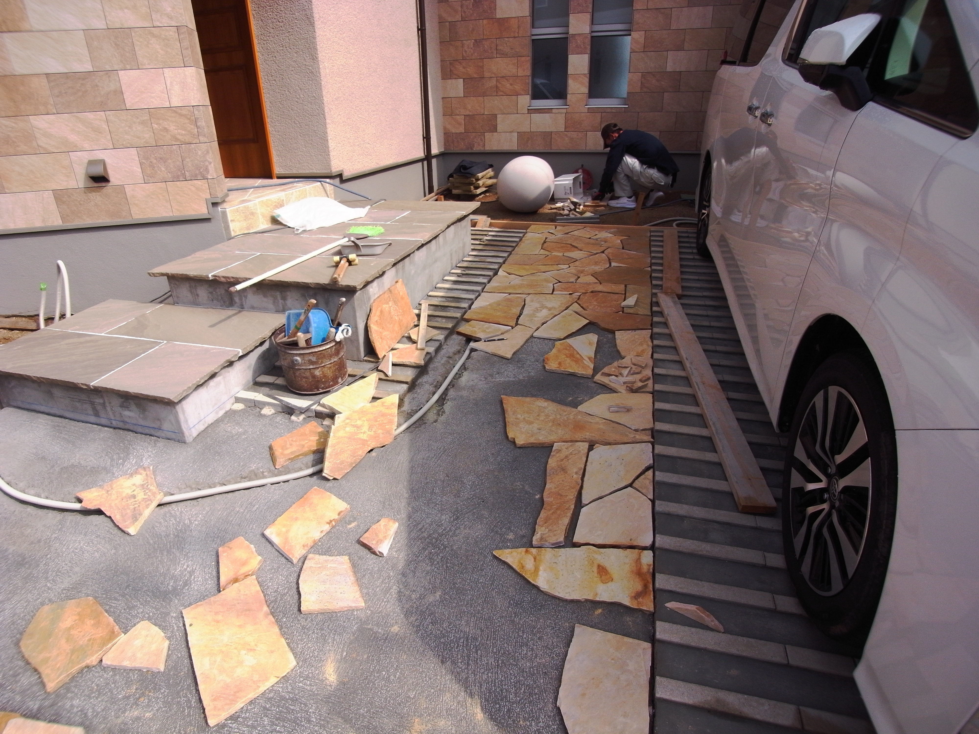 ただいま施工中 【エレガントな家】駐車場の舗装をしていきます。 広島市安佐南区 K様邸 新築外構工事 【エレガントな家】駐車場の舗装をしていきます。 広島市安佐南区 K様邸 新築外構工事 K様邸の 新築外構工事。 駐車場 の 舗装 をしていきます。 乱形の石貼り・緑化ブロック・インターロッキング を組み合わせていきます。 完成イメージパース 完成イメージパース 敷材 を置く所以外の部分に 土間コンクリート打ち をします。 緑化ブロック を敷きます。 目地 には 人工芝 を入れていきます。 乱形の石貼り もしていきます。 階段 の 天面 には 自然石 を置きました。 こちらの 自然石 の色は、K様邸によく合う 柔らかい色です。 K様邸の 新築外構工事、いよいよ大詰めです。 次は 植栽 作業をしていきます。