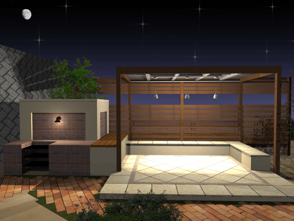 パースギャラリー 食を楽しむ庭 夜のバーベキューも愉しく! 夜のバーベキューも愉しく! オンリーワンのランプがついたレンガ貼のバーベキュー炉。おしゃれでもあり、実用性にも富んでいます。 このベンチは、収納兼ベンチ兼調理台にもなってしまうマルチベンチです! 夜も素敵な雰囲気の中、食事を楽しむことが出来ます。調理台の手元も明るく、使いやすいですね。 テーブル側から見たアングル。 アプローチはレンガを敷き詰めています。 TOEXプラスGと、デザイナーズパーツを使い、スタイリッシュなテラスと目隠しができました。
