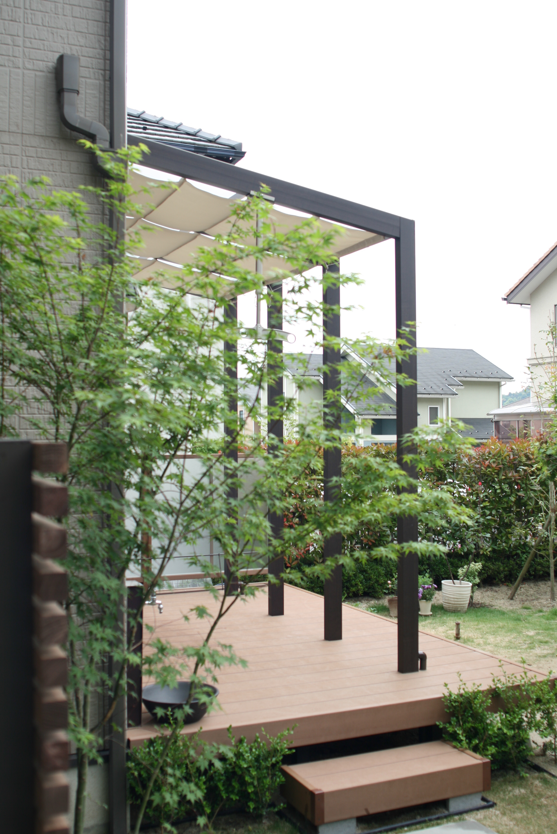 施工ギャラリー 庭周り 雑草がはびこる庭を変身 広島市安佐南区 雑草がはびこる庭を変身 広島市安佐南区 ココマテラスと樹の木デッキ(TOEX)ができました。 日除けもつけました。 リビング前の庭のところを変えます。 樹の木デッキとココマテラス(日除け付き) 境界側には目隠しフェンス(プライバシーパネルで目隠し) 和室前には木製フェンスで目隠しをしました。 和室前の木製フェンスは角材の横張りです。 立水栓はデッキの上に移設して モダンな雰囲気になりました。 ガレージからの目線も木製フェンスで 目隠しとなっています。